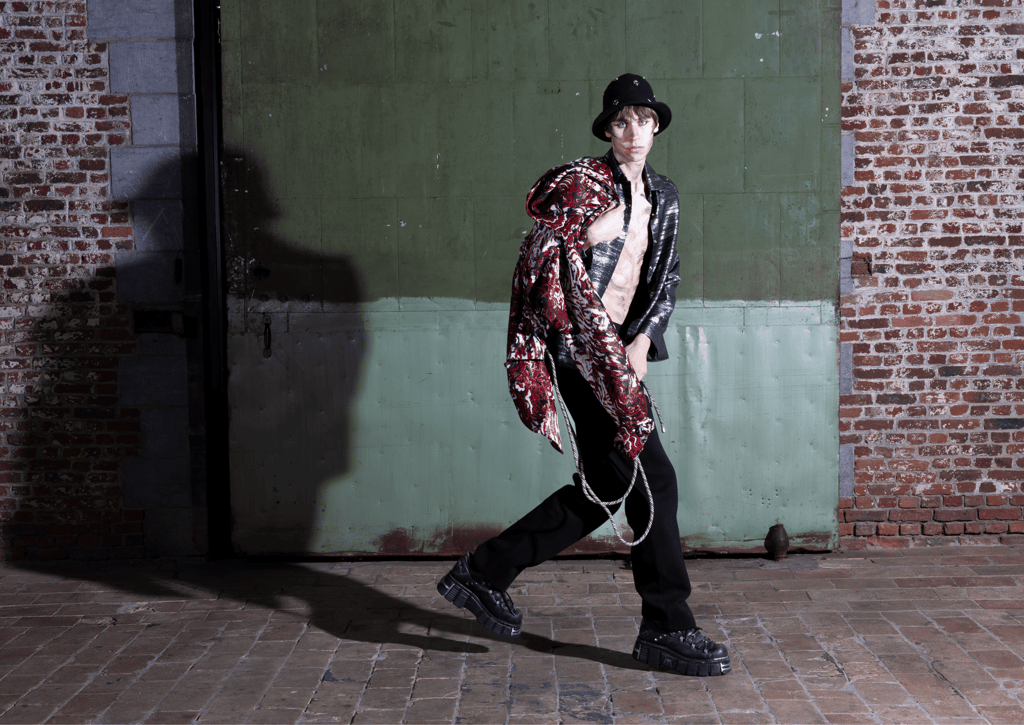 A dance between presence and illusion, where the body morphs into creativity itself. Like a nomad, it shifts between worlds, adapting and blending. Fabric, skin, and makeup merge, dissolving boundaries of identity and space. In collaboration with Jean Paul L'Espagnard, fashion becomes a second skin—an expression of fluidity and transformation.